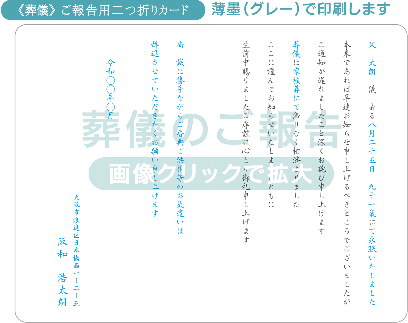 二つ折りカードを封入し、切手を貼って投函してください。水色の文字が変更される箇所です。